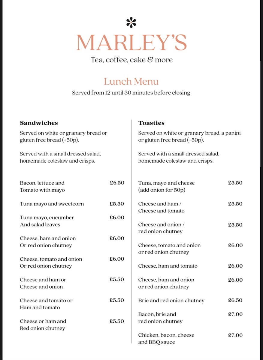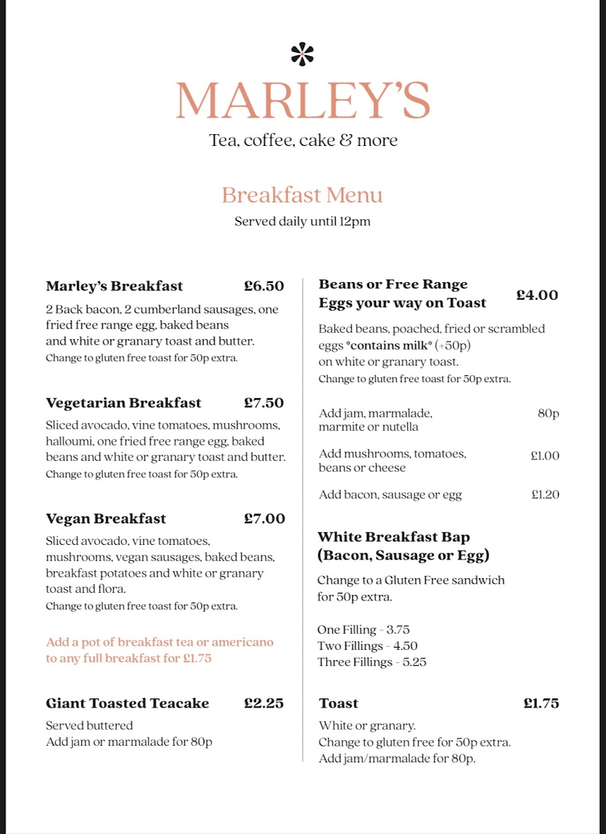 Introducing the menu at Marley’s Cafe and Tearooms is a delightful journey through comforting flavors and quality ingredients. Nestled in Wheathampstead, this charming cafe offers an array of satisfying options. Start your day with their hearty Marley's Breakfast or choose a light bite like the White Breakfast Bap.